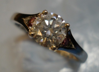 Beautiful Engagement Ring set with 2 x 2mm Pink (heat treated) Diamonds (.035pt each totalling .07pts) 1 x 82pts, Colour G/H, Diamond set in a Platinum ring and setting. Check out the matching wedding ring click here