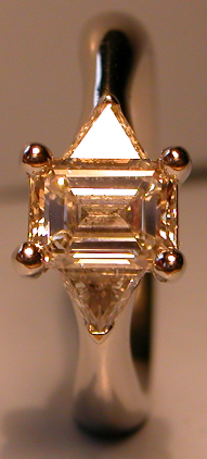 Classic 3 stone setting on a full but shaped band sets off these emerald cut and triangular diamonds