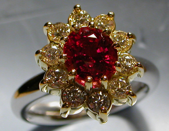 Red spinel and white diamonds lifted in the setting on a full ring makes having a plain wedding band really easy
