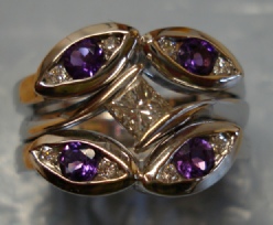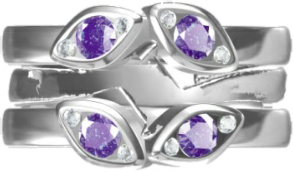 A tricky shape engagement ring made for a tricky shaped wedding ring. The husband to be was an engineer so he came up with a different design. 9ct white gold, channel set with 3mm Amethysts and small diamonds make this wedding ring truly spectacular. The wedding ring needed to surround the engagement ring with the facility for the engagement ring to be removed at any time. This was a job for CAD