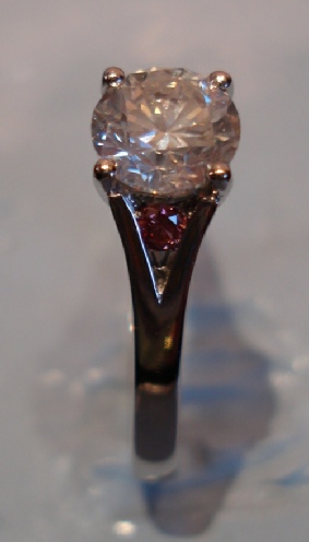 Set in platinum this beautiful diamond is flanked by 2 small pink diamonds